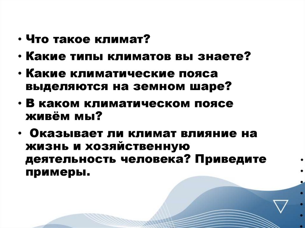 5. Климатические условия влияют на жизнь и хозяйственную деятельность людей.