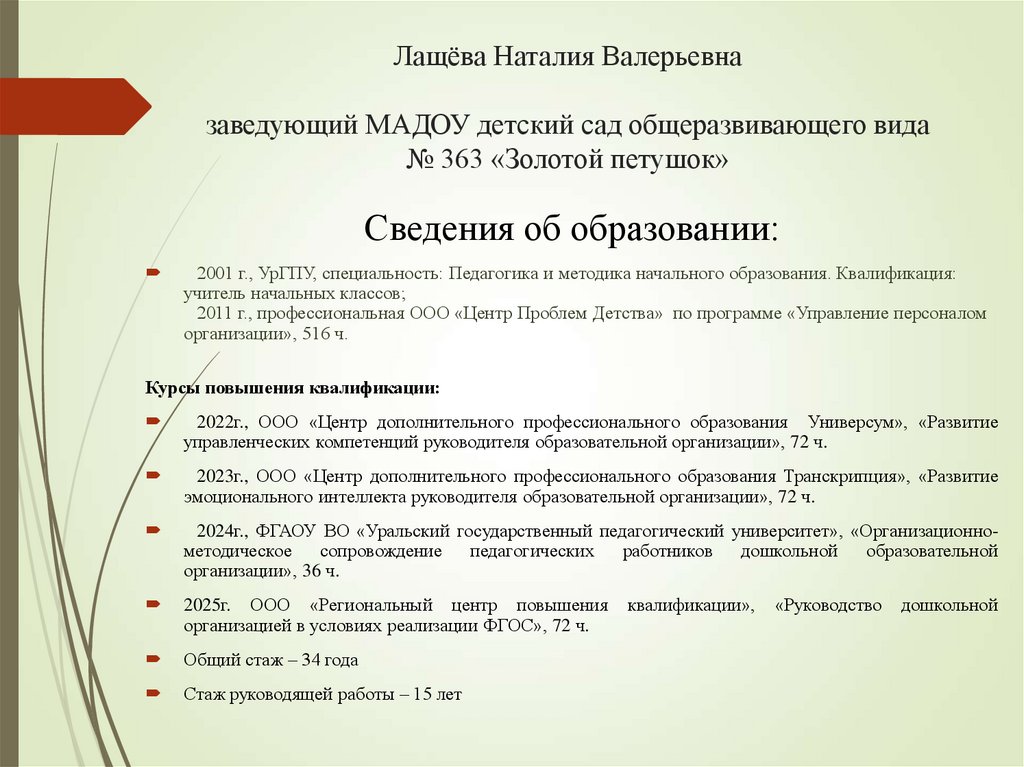 1. Лащёва Наталия Валерьевна заведующий МАДОУ детский сад общеразвивающего вида № 363 «Золотой петушок»