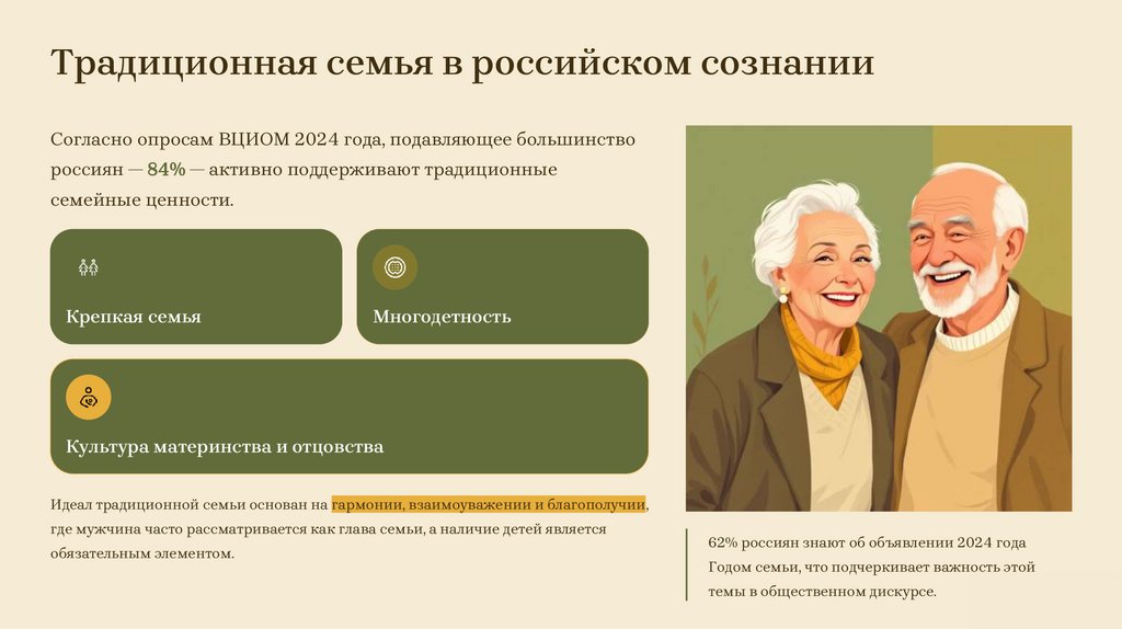 Традиционная семья в российском сознанииСогласно опросам ВЦИОМ 2024 года, подавляющее большинство
