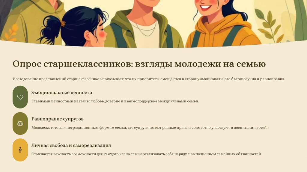Опрос старшеклассников: взгляды молодежи на семьюИсследование представлений старшеклассников показывает, что их приоритеты смещаются в сторону эмоционального благополучия и равноправия.