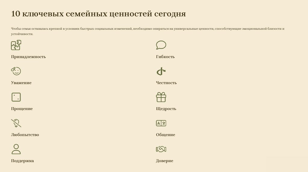 10 ключевых семейных ценностей сегодняЧтобы семья оставалась крепкой в условиях быстрых социальных изменений, необходимо опираться на универсальные ценности, способствующие эмоциональной близости и