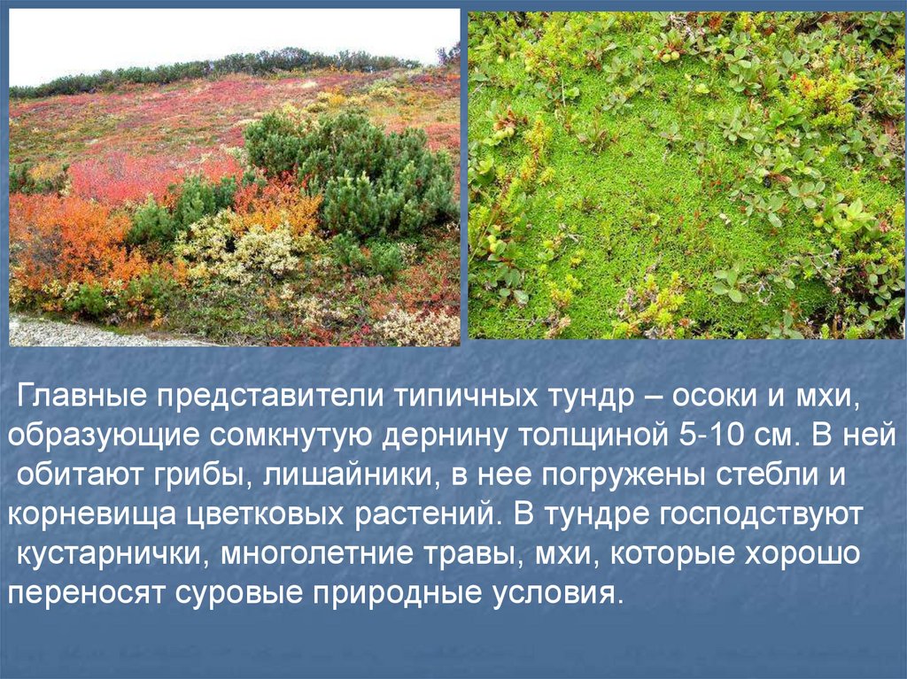Главные представители типичных тундр – осоки и мхи,образующие сомкнутую дернину толщиной 5-10 см. В ней