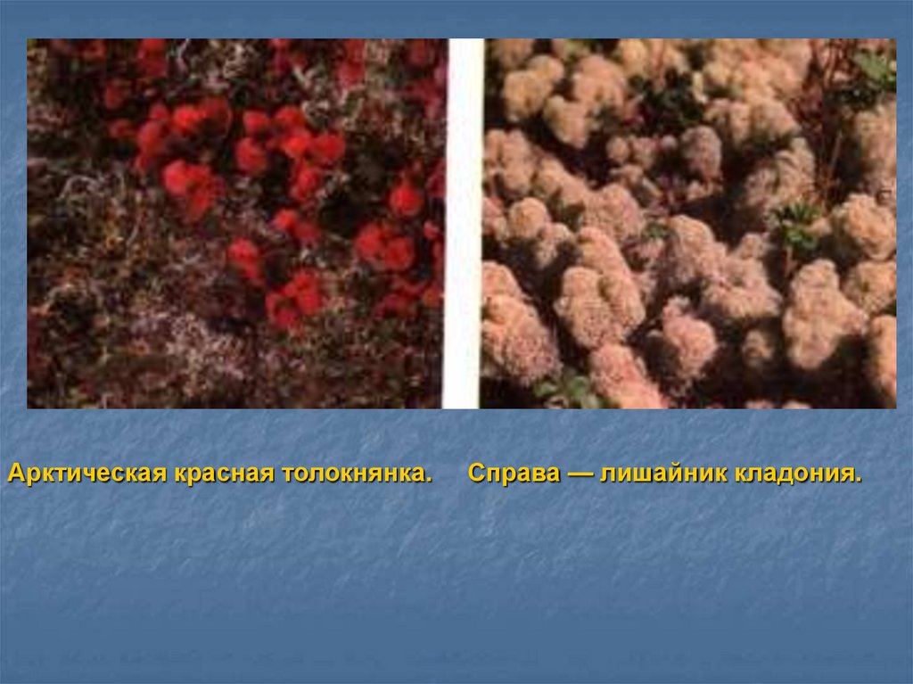 Арктическая красная толокнянка.Справа — лишайник кладония.