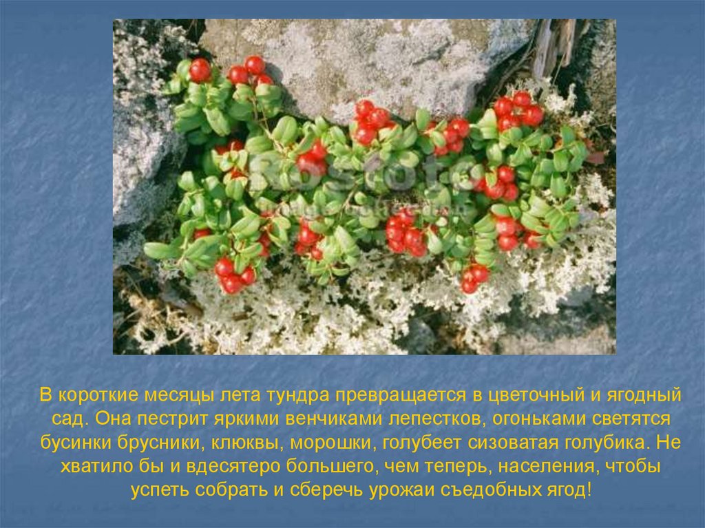 В короткие месяцы лета тундра превращается в цветочный и ягодныйсад. Она пестрит яркими венчиками лепестков, огоньками светятся