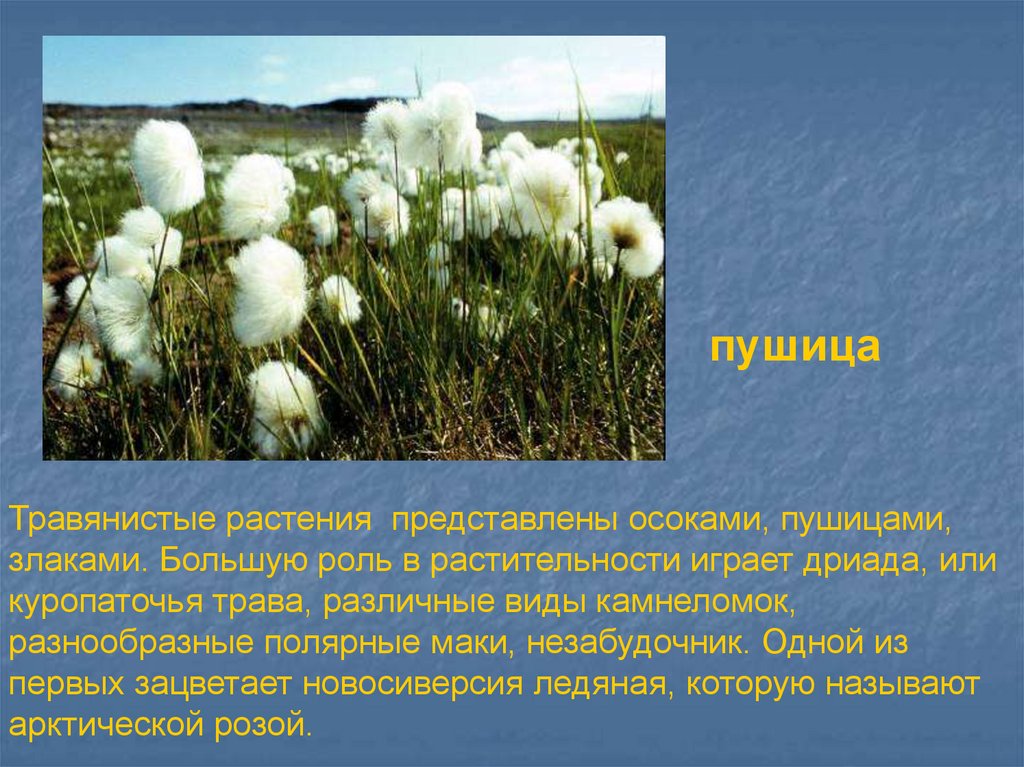 пушицаТравянистые растения представлены осоками, пушицами,