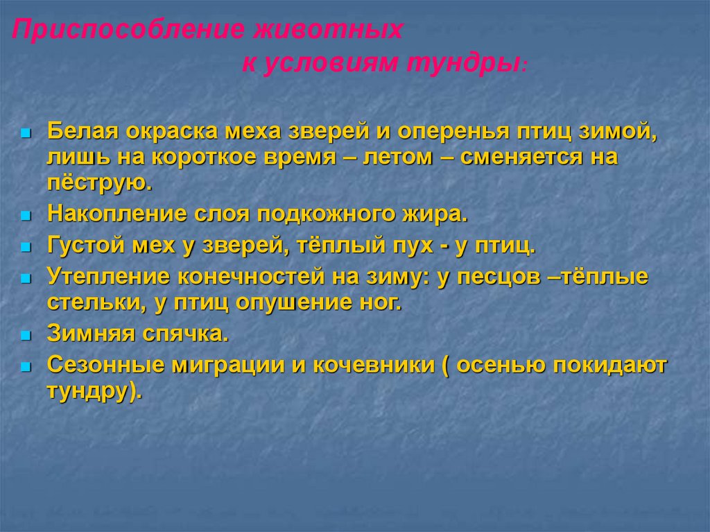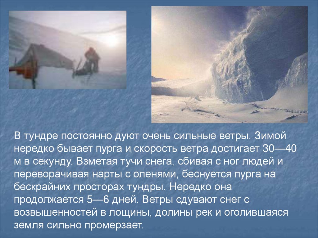 В тундре постоянно дуют очень сильные ветры. Зимой нередкобывает пурга и скорость ветра достигает 30—40 м в секунду. Взметая