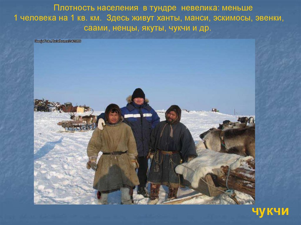 Плотность населения в тундре невелика: меньше1 человека на 1 кв. км. Здесь живут ханты, манси, эскимосы, эвенки,