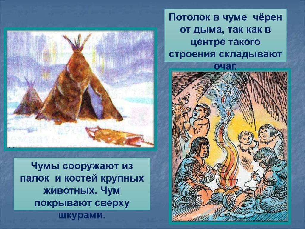 Потолок в чуме чёренот дыма, так как в