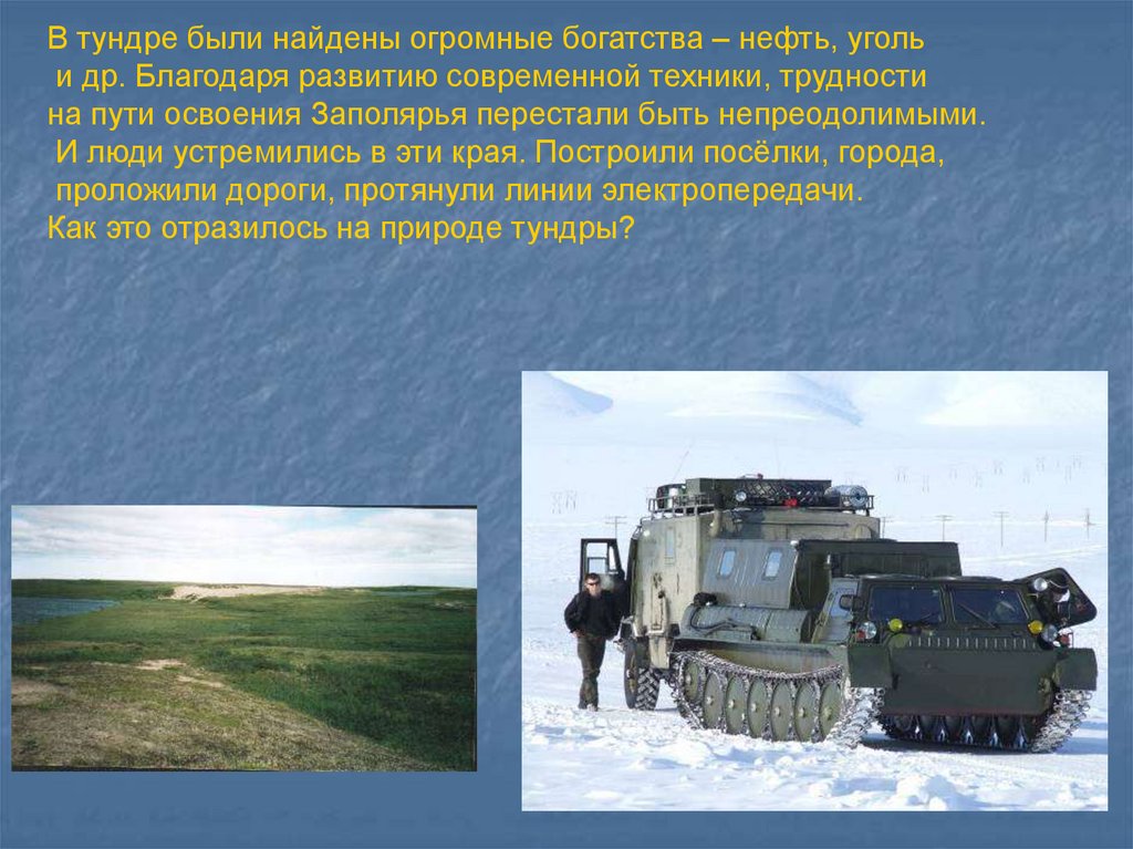 В тундре были найдены огромные богатства – нефть, угольи др. Благодаря развитию современной техники, трудности