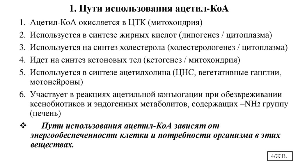 1. Пути использования ацетил-КоА1. Ацетил-КоА окисляется в ЦТК (митохондрия)