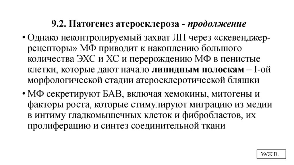 9.2. Патогенез атеросклероза - продолжение• Однако неконтролируемый захват ЛП через «скевенджеррецепторы» МФ приводит к накоплению большого