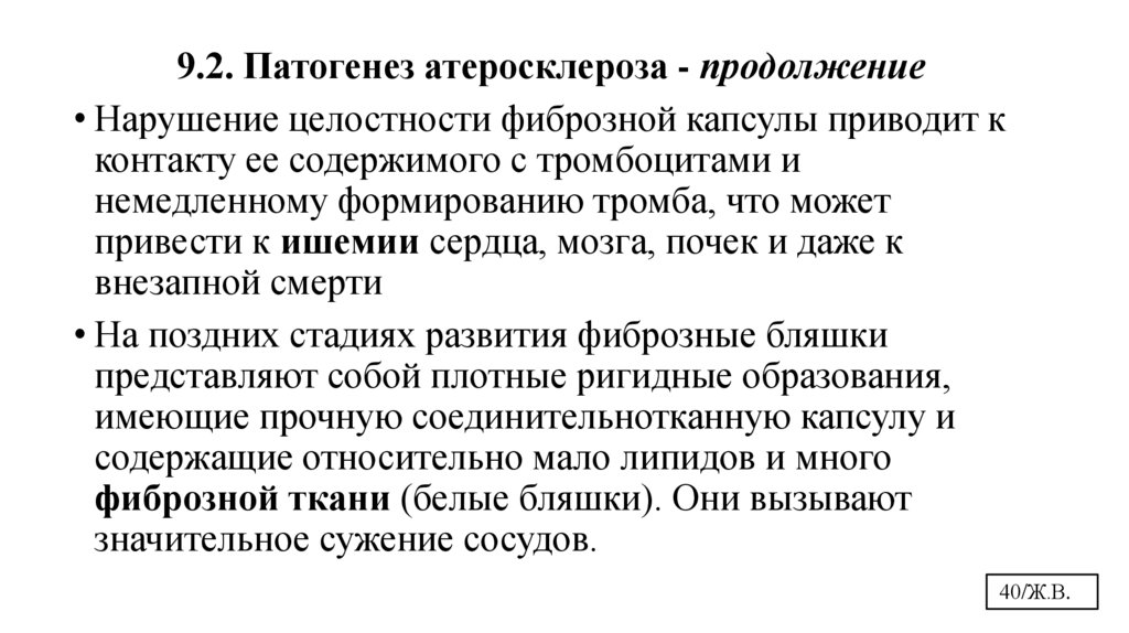 9.2. Патогенез атеросклероза - продолжение• Нарушение целостности фиброзной капсулы приводит к