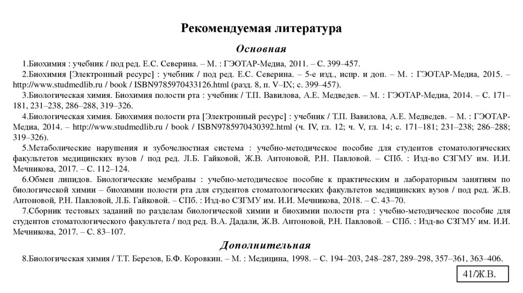 1.Биохимия : учебник / под ред. Е.С. Северина. – М. : ГЭОТАР-Медиа, 2011. – С. 399–457.