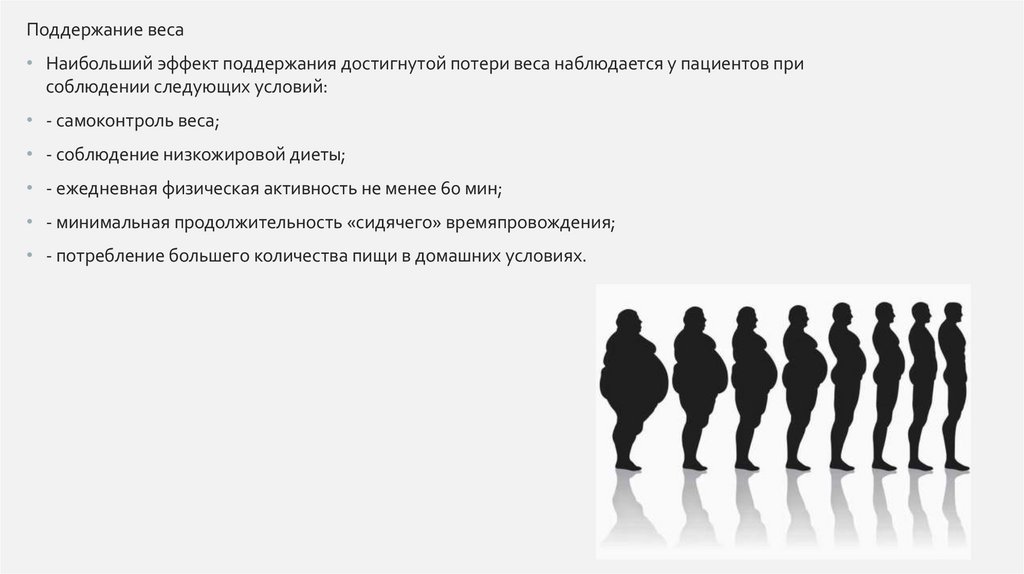Поддержание веса• Наибольший эффект поддержания достигнутой потери веса наблюдается у пациентов при