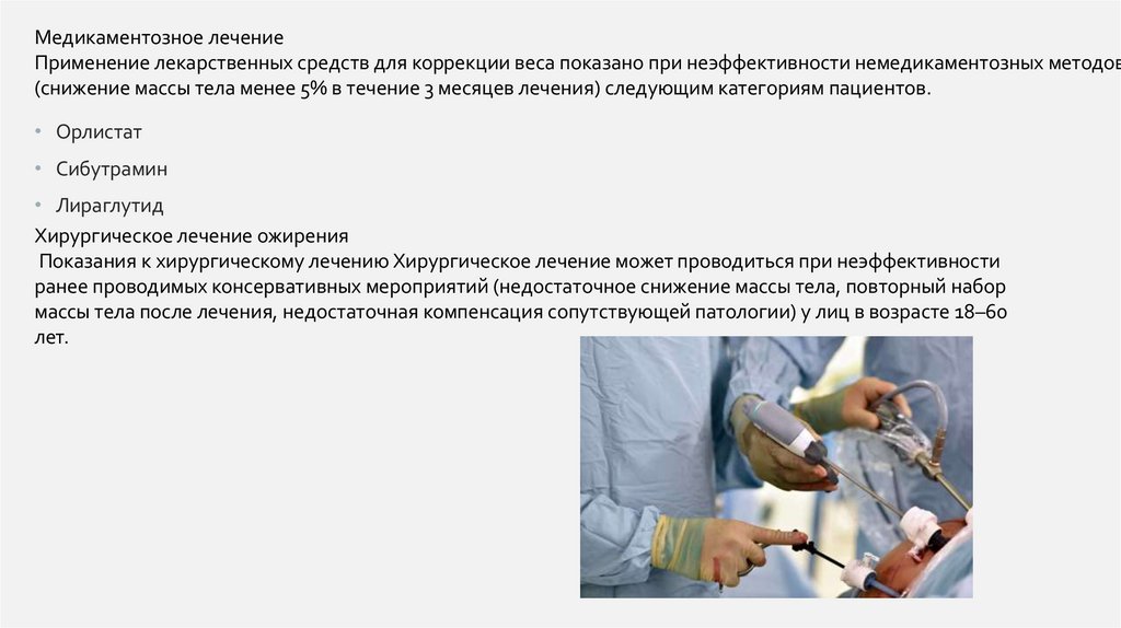 Медикаментозное лечениеПрименение лекарственных средств для коррекции веса показано при неэффективности немедикаментозных методов
