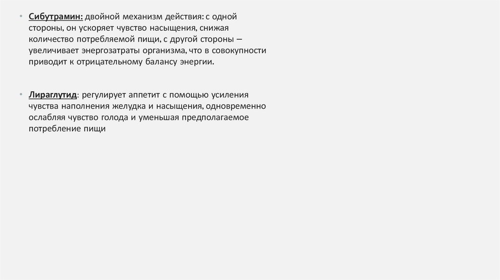 • Сибутрамин: двойной механизм действия: с однойстороны, он ускоряет чувство насыщения, снижая