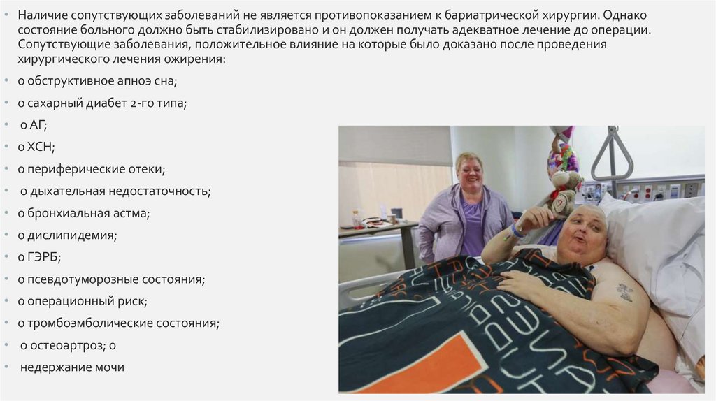• Наличие сопутствующих заболеваний не является противопоказанием к бариатрической хирургии. Однакосостояние больного должно быть стабилизировано и он должен получать адекватное лечение до операции.