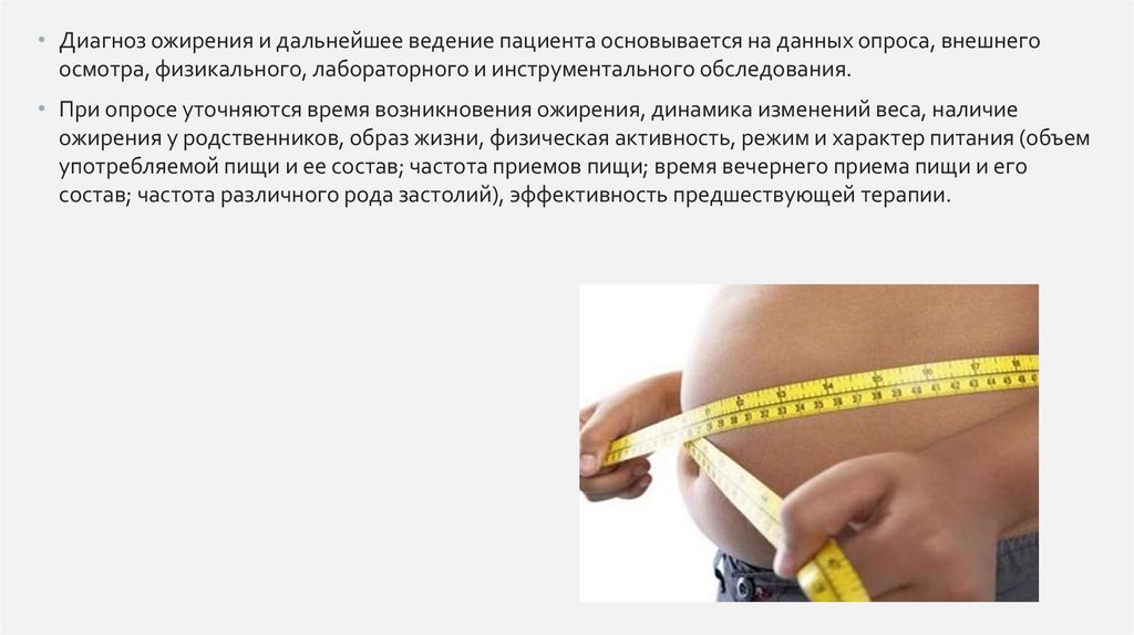 • Диагноз ожирения и дальнейшее ведение пациента основывается на данных опроса, внешнегоосмотра, физикального, лабораторного и инструментального обследования.