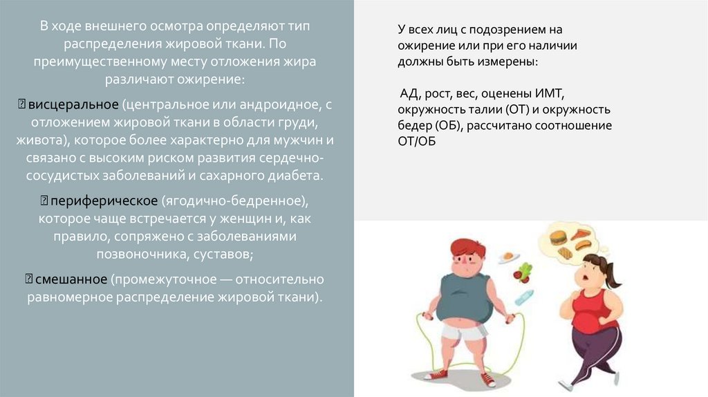 В ходе внешнего осмотра определяют типраспределения жировой ткани. По