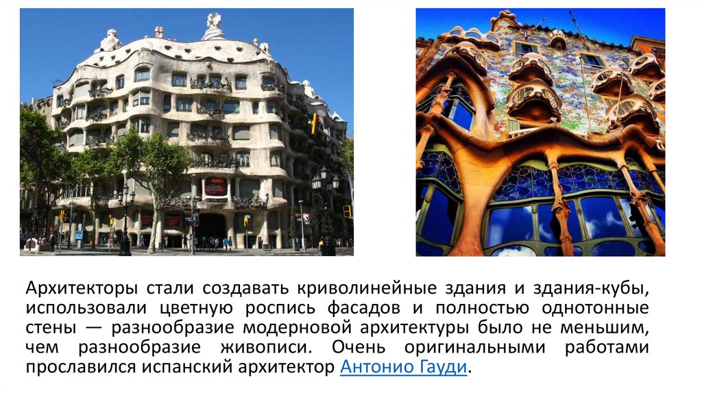 Архитекторы стали создавать криволинейные здания и здания-кубы,использовали цветную роспись фасадов и полностью однотонные