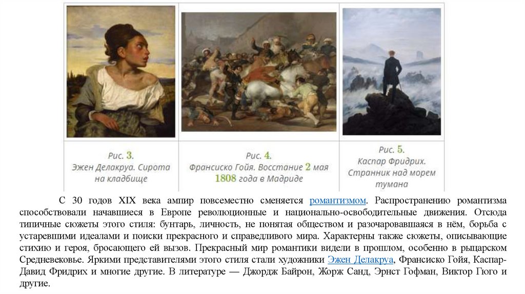 Средневековье. Яркими представителями этого стиля стали художники Эжен Делакруа, Франсиско Гойя, КаспарДавид Фридрих и многие другие. В литературе — Джордж Байрон, Жорж Санд, Эрнст Гофман, Виктор Гюго и