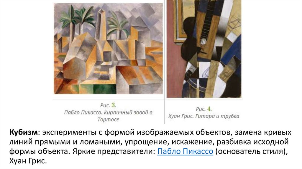 Кубизм: эксперименты с формой изображаемых объектов, замена кривыхлиний прямыми и ломаными, упрощение, искажение, разбивка исходной