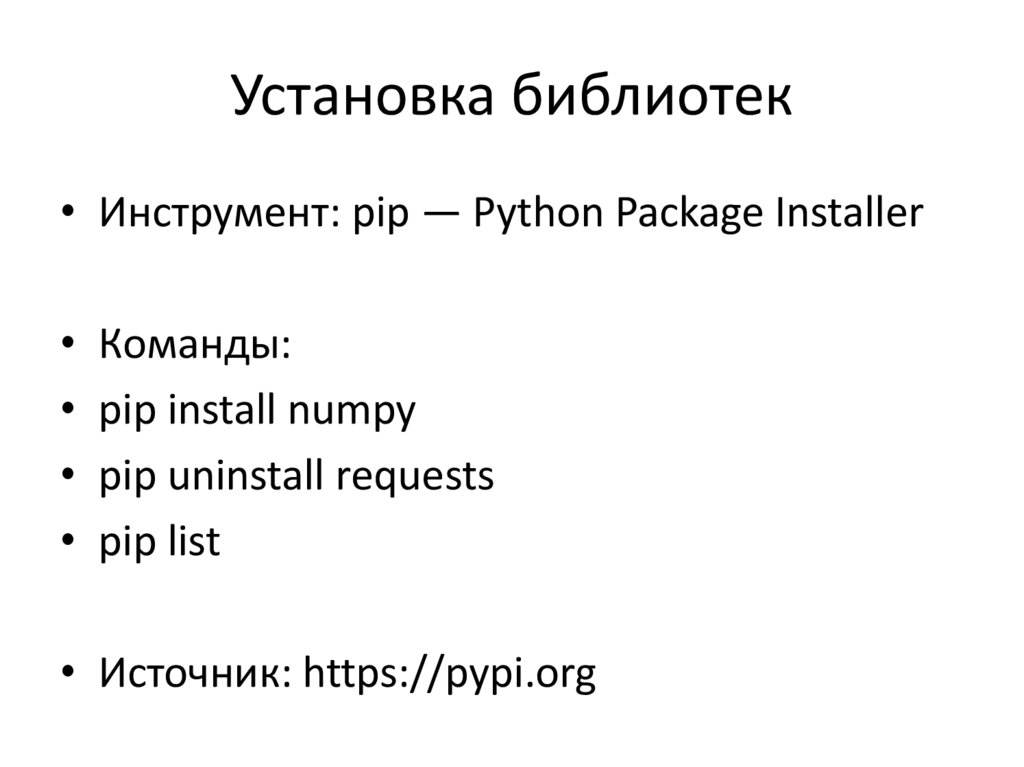Установка библиотек• Инструмент: pip — Python Package Installer