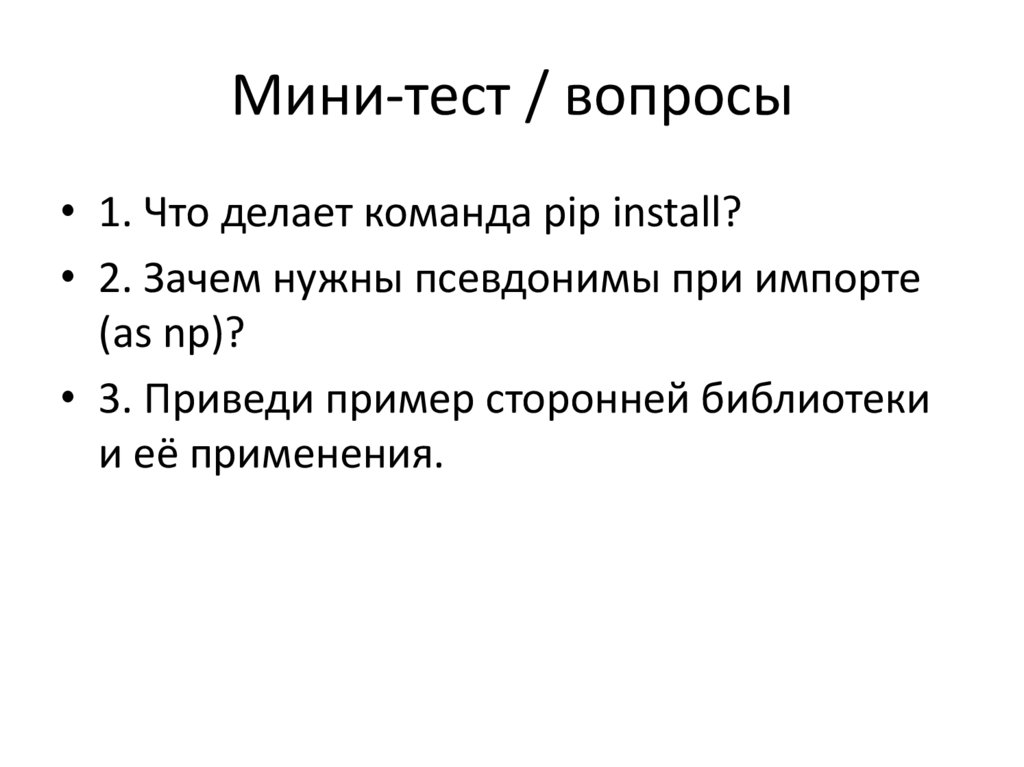 Мини-тест / вопросы• 1. Что делает команда pip install?