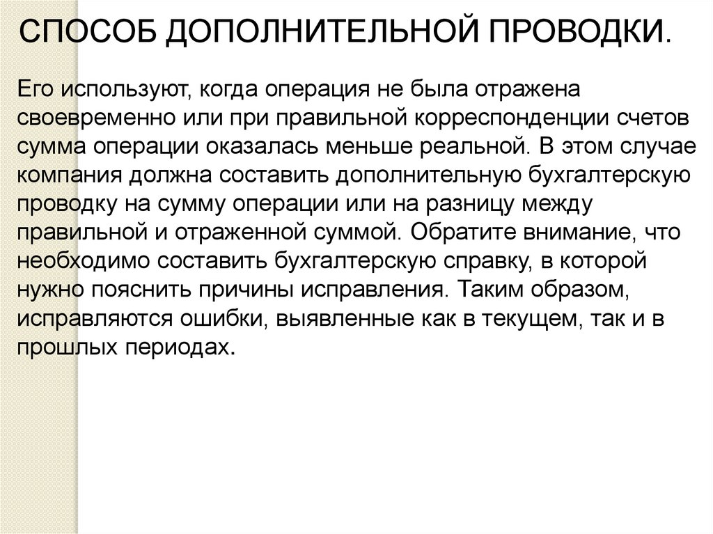 СПОСОБ ДОПОЛНИТЕЛЬНОЙ ПРОВОДКИ.Его используют, когда операция не была отражена