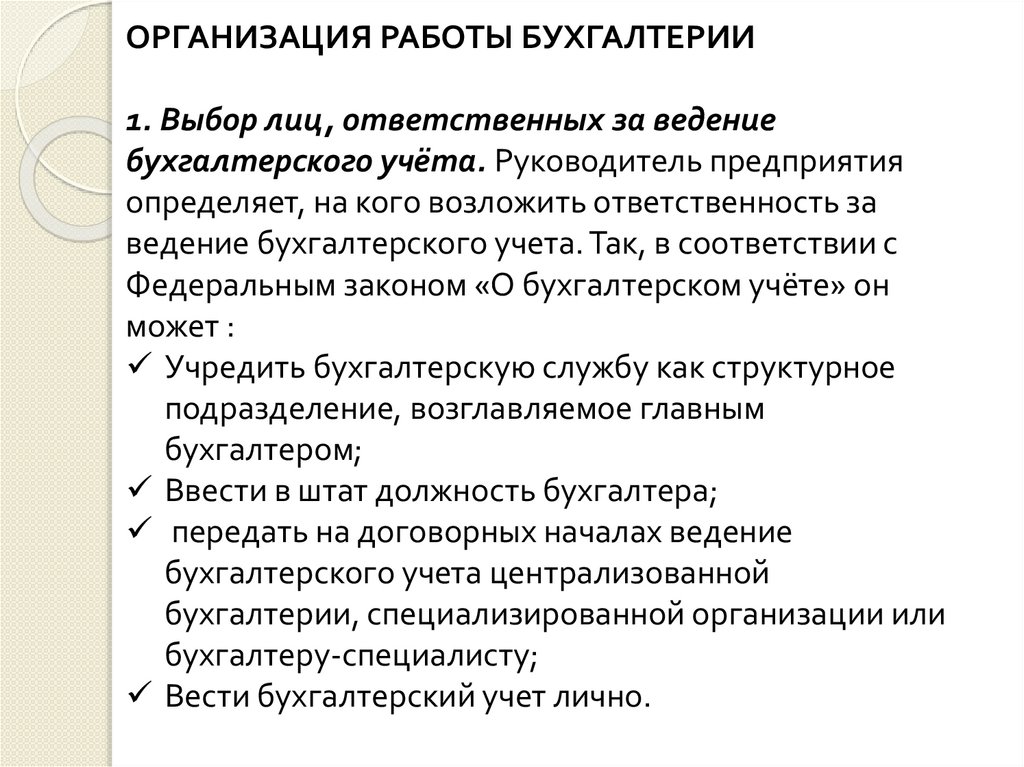 ОРГАНИЗАЦИЯ РАБОТЫ БУХГАЛТЕРИИ1. Выбор лиц, ответственных за ведение