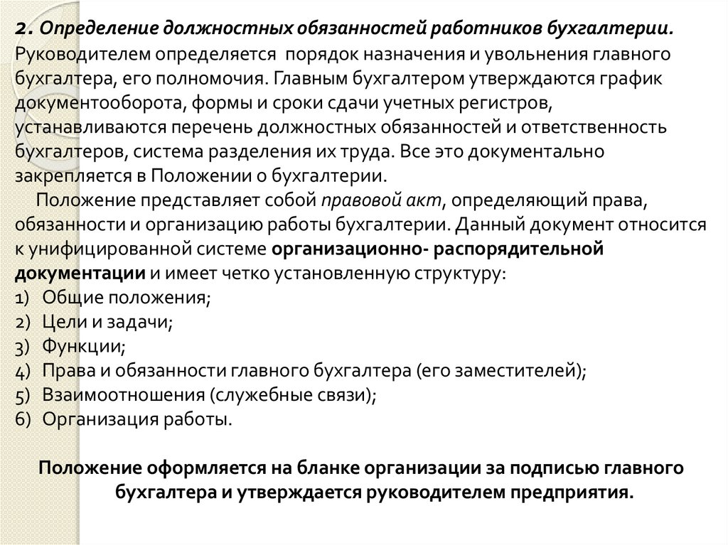 2. Определение должностных обязанностей работников бухгалтерии.Руководителем определяется порядок назначения и увольнения главного
