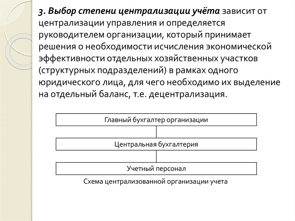 3. Выбор степени централизации учёта зависит отцентрализации управления и определяется