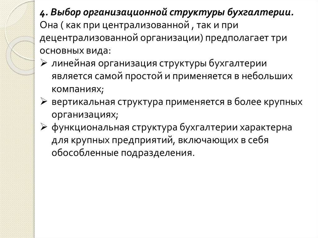 4. Выбор организационной структуры бухгалтерии.Она ( как при централизованной , так и при