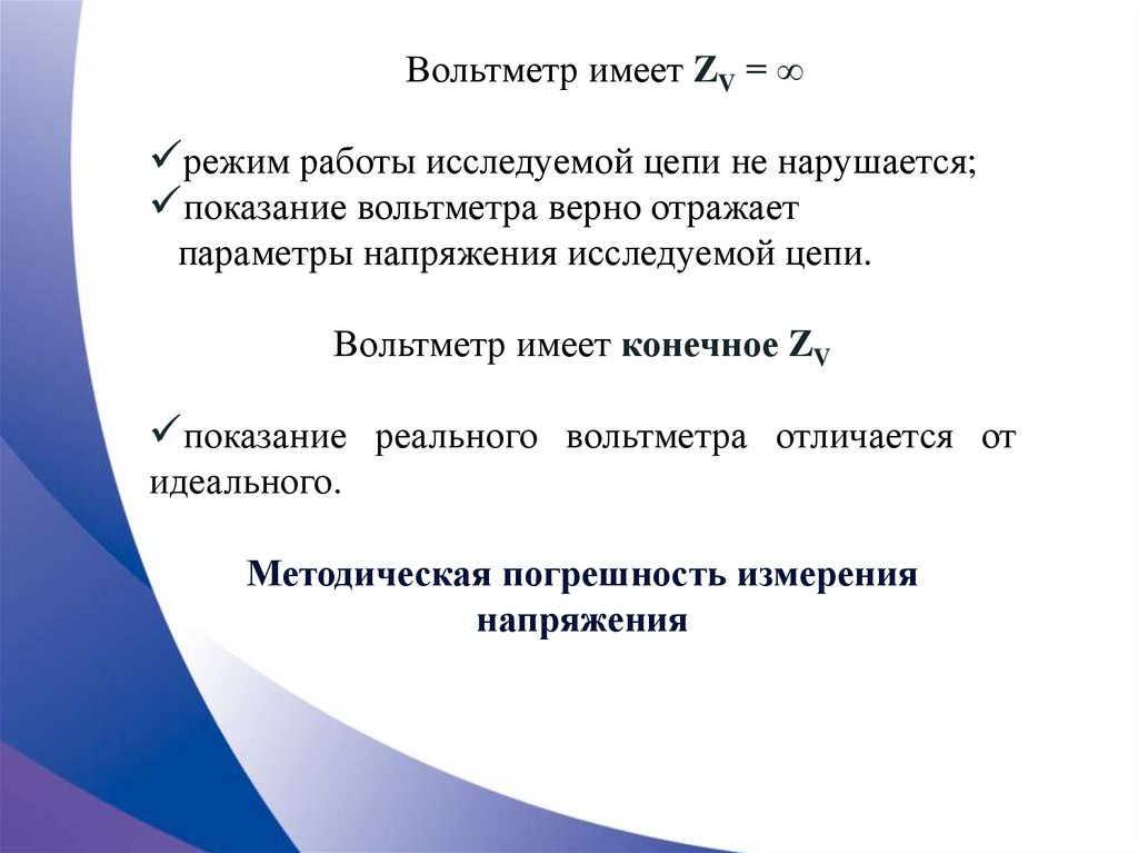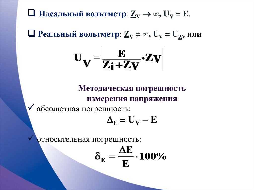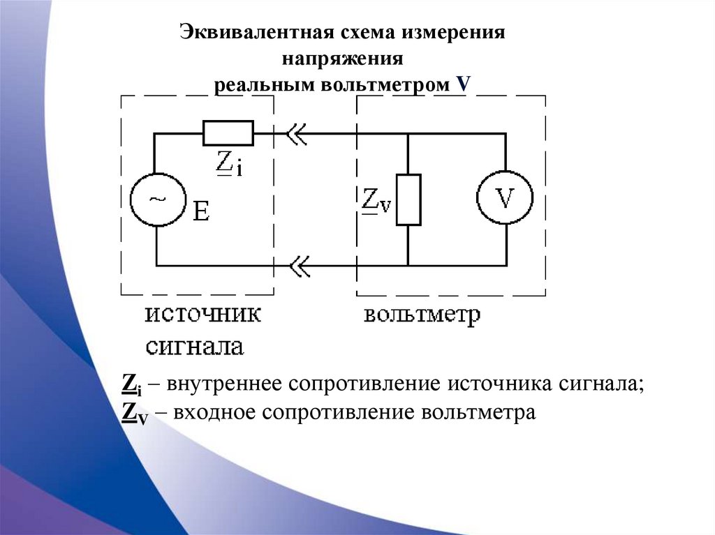 Идеальный вольтметр: ZV ∞, UV = Е.Реальный вольтметр: ZV ≠ ∞, UV = UZV или