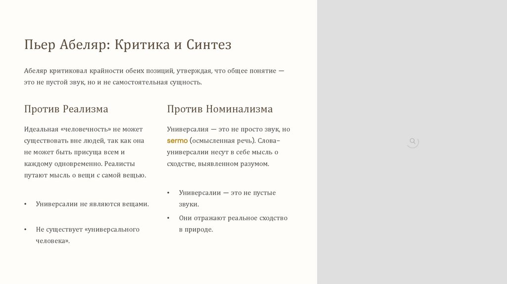 Пьер Абеляр: Критика и СинтезАбеляр критиковал крайности обеих позиций, утверждая, что общее понятие —