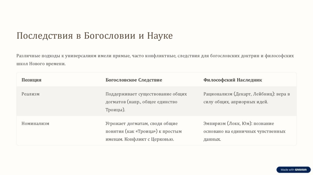 Последствия в Богословии и НаукеРазличные подходы к универсалиям имели прямые, часто конфликтные, следствия для богословских доктрин и философских