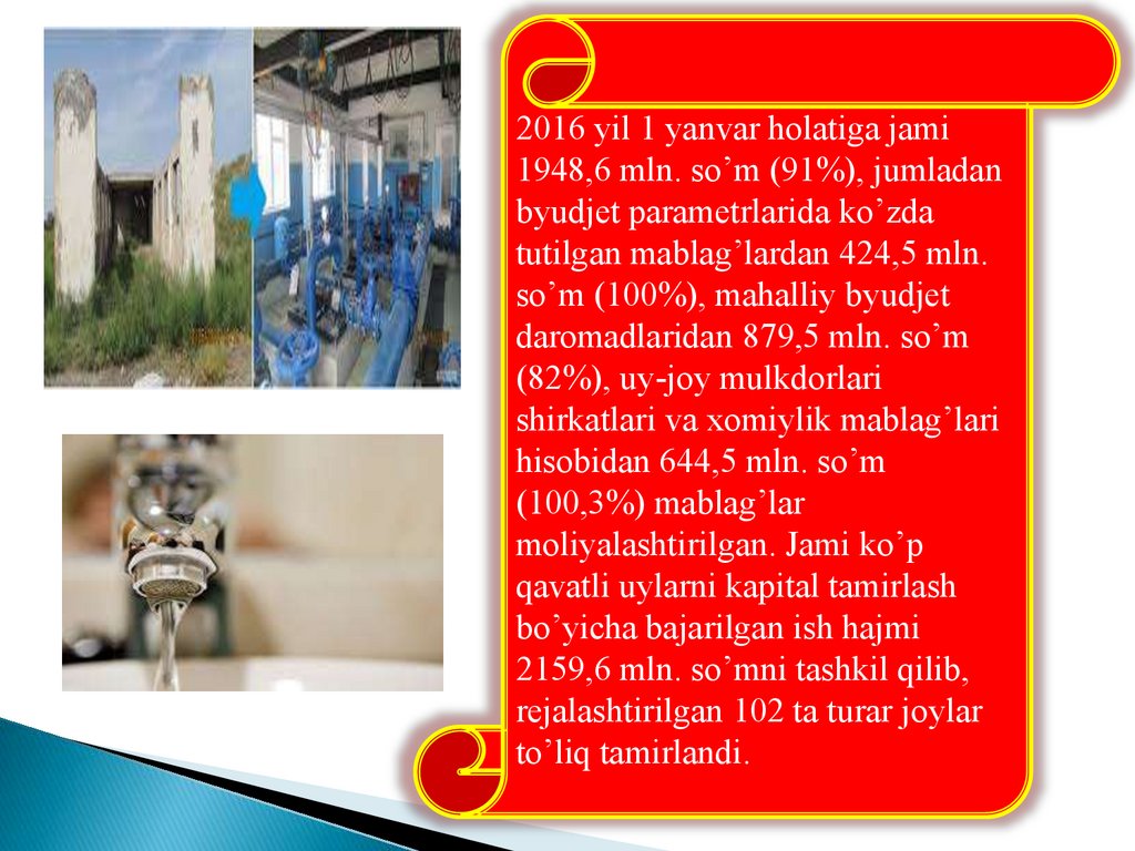 2016 yil 1 yanvar holatiga jami1948,6 mln. so’m (91%), jumladan