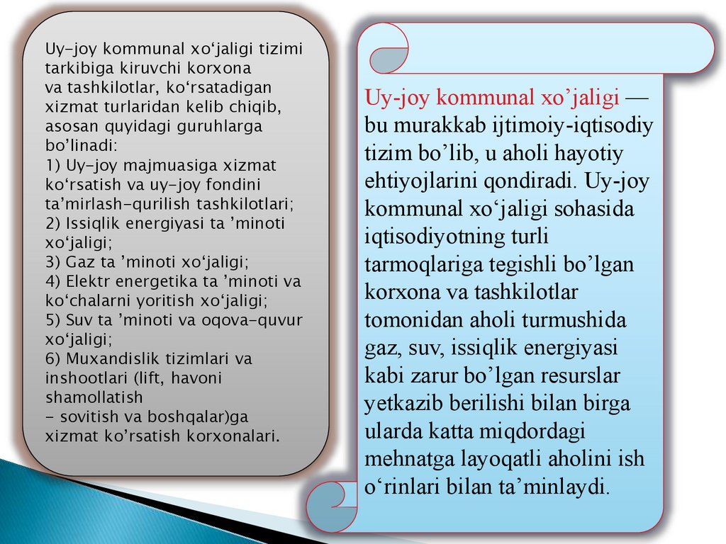 Mavzu: Uy-joy kommunal xo’jaligi tarmog’ining rivojlanishidagi