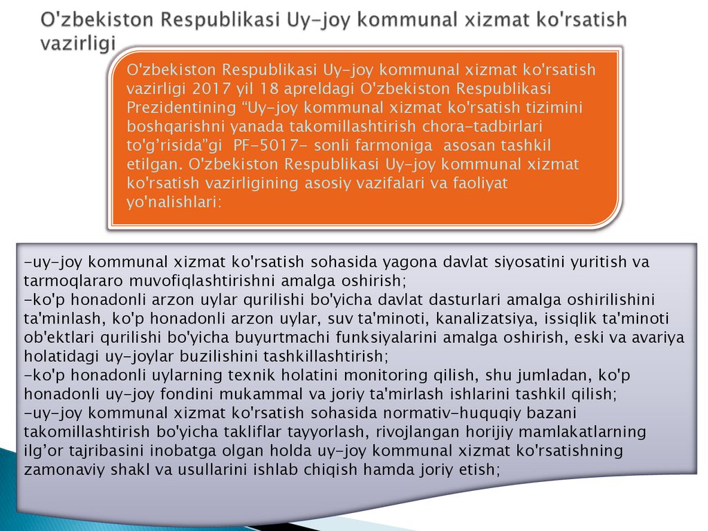 O'zbekiston Respublikasi Uy-joy kommunal хizmat ko'rsatishvazirligi 2017 yil 18 apreldagi O'zbekiston Respublikasi
