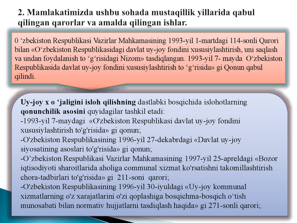0 ‘zbekiston Respublikasi Vazirlar Mahkamasining 1993-yil 1-martdagi 114-sonli Qaroribilan «O‘zbekiston Respublikasidagi davlat uy-joy fondini xususiylashtirish, uni saqlash