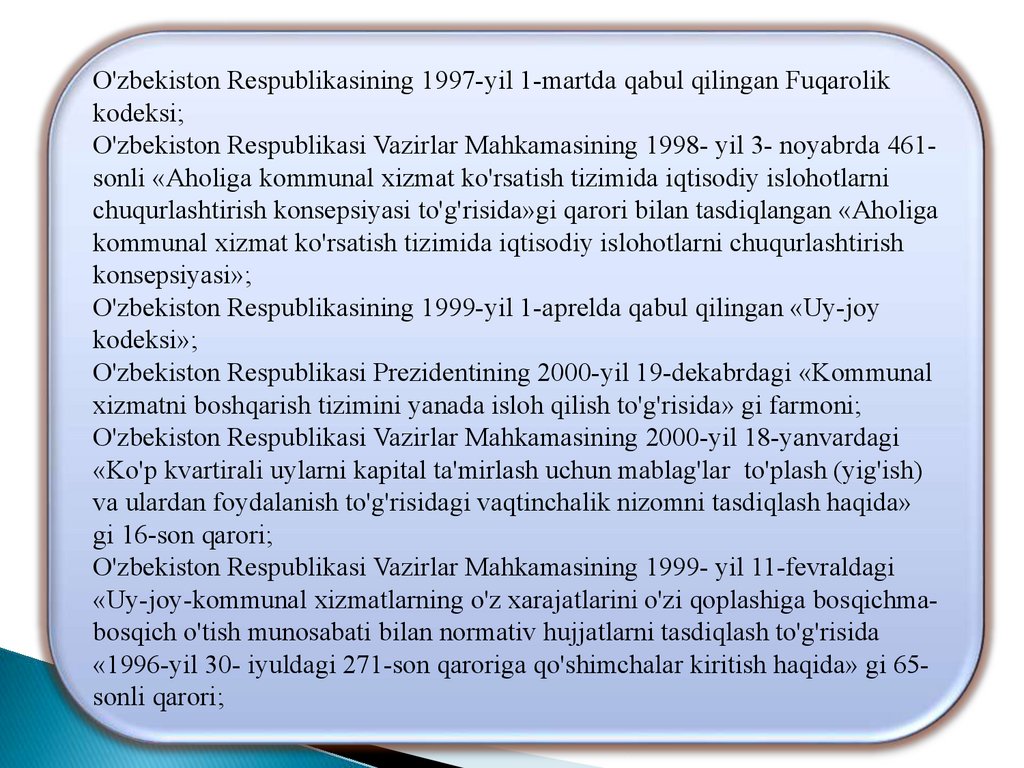 -uy-joy kommunal хizmat ko'rsatish sohasida normativ-huquqiy bazani