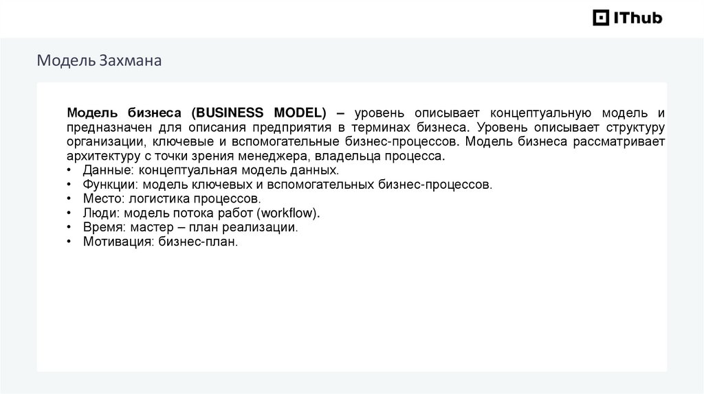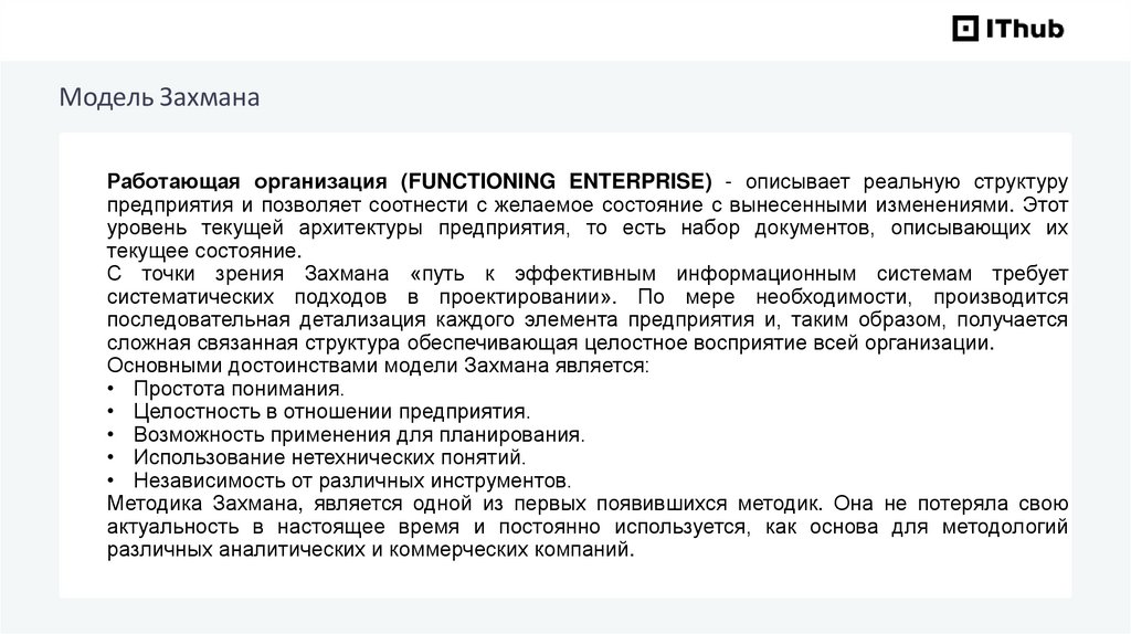 Модель ЗахманаРаботающая организация (FUNCTIONING ENTERPRISE) - описывает реальную структуру