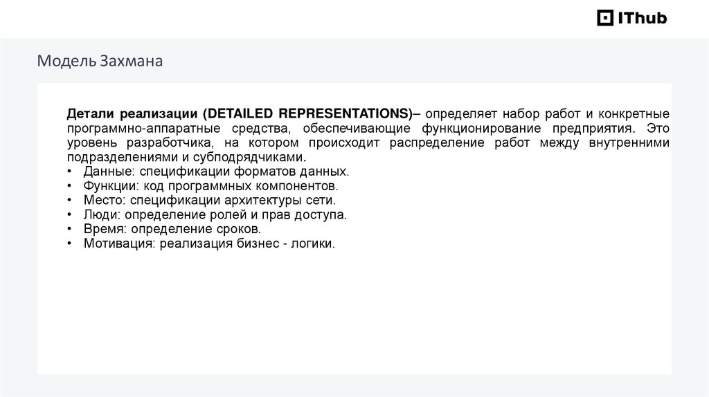 Модель ЗахманаДетали реализации (DETAILED REPRESENTATIONS)– определяет набор работ и конкретные