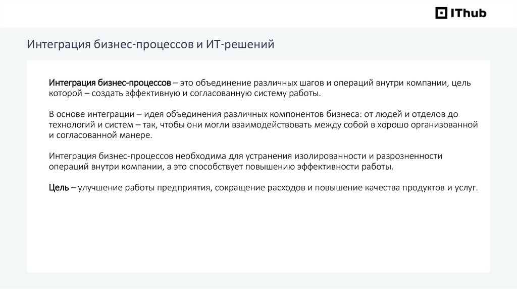 Интеграция бизнес-процессов и ИТ-решенийИнтеграция бизнес-процессов – это объединение различных шагов и операций внутри компании, цель