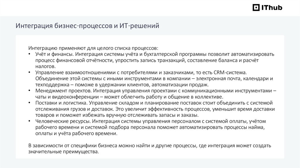 Интеграция бизнес-процессов и ИТ-решенийИнтеграцию применяют для целого списка процессов: