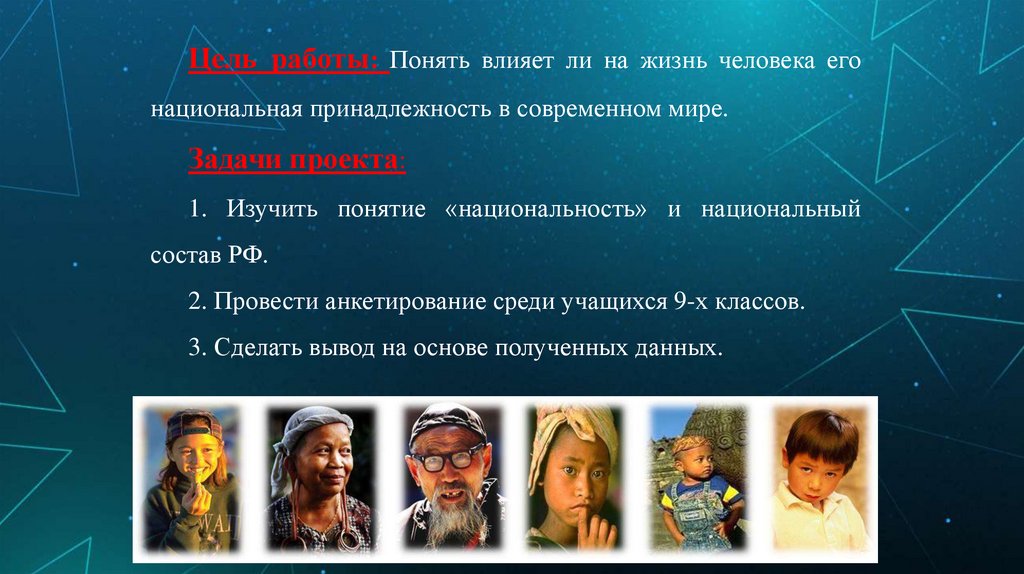 Цель работы: Понять влияет ли на жизнь человека егонациональная принадлежность в современном мире.