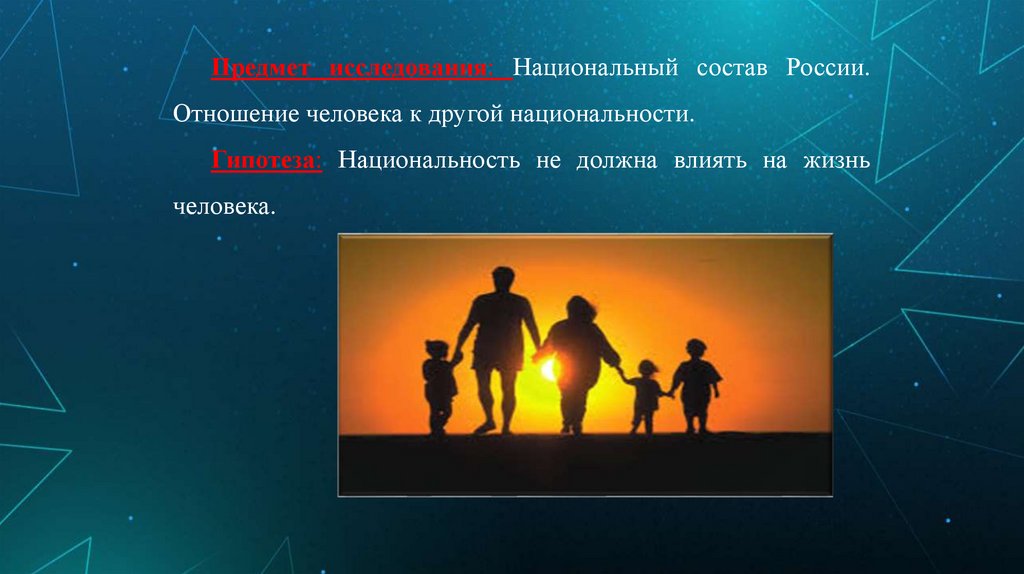 Предмет исследования: Национальный состав России.Отношение человека к другой национальности.