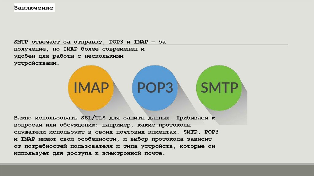 ЗаключениеSMTP отвечает за отправку, POP3 и IMAP — за