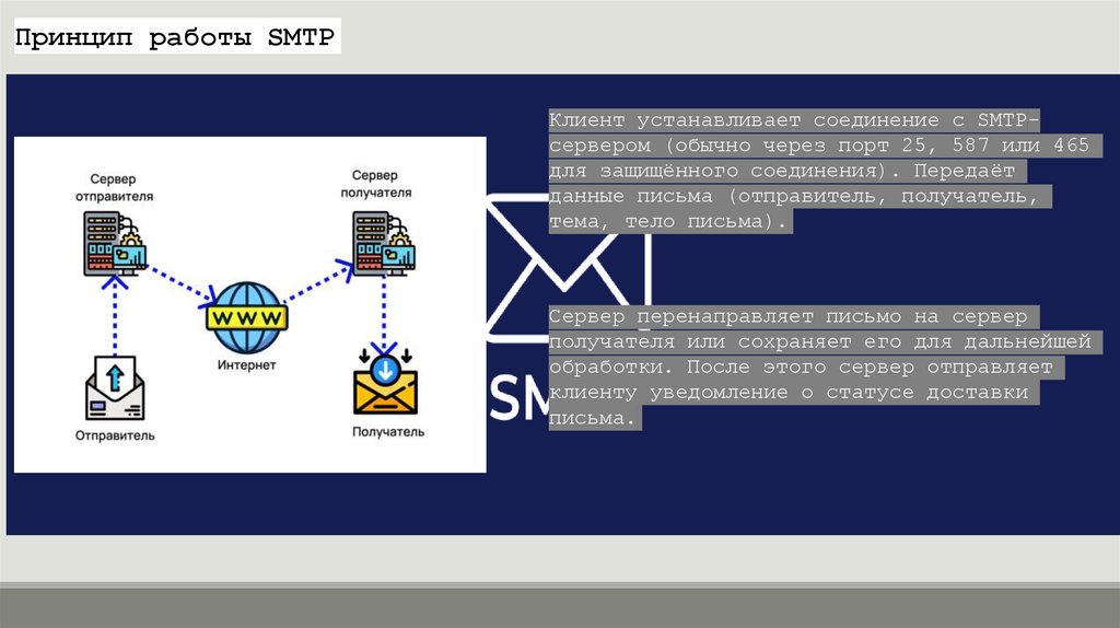 Принцип работы SMTPКлиент устанавливает соединение с SMTPсервером (обычно через порт 25, 587 или 465