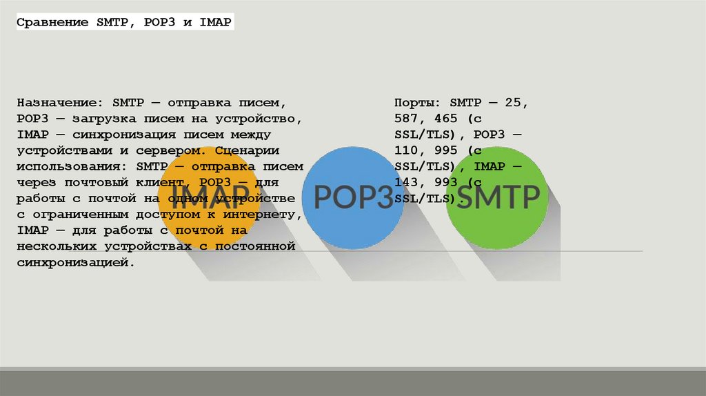 Сравнение SMTP, POP3 и IMAPНазначение: SMTP — отправка писем,